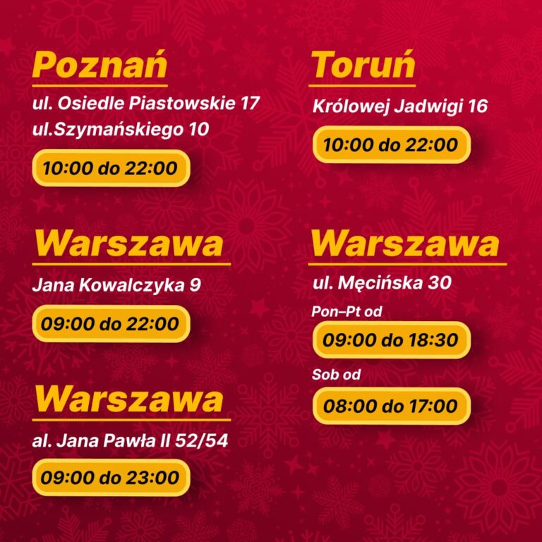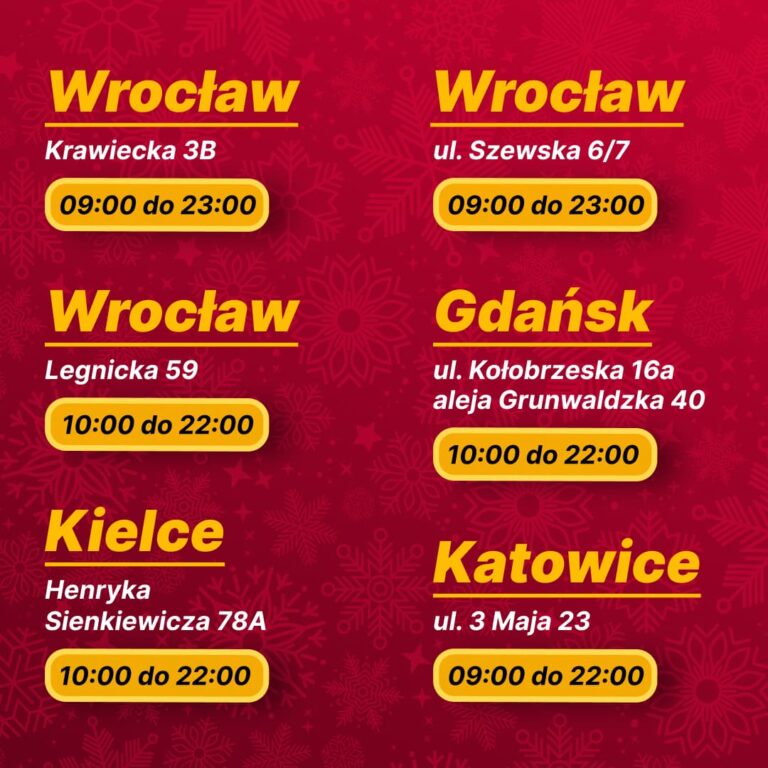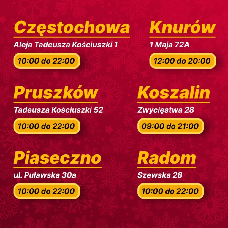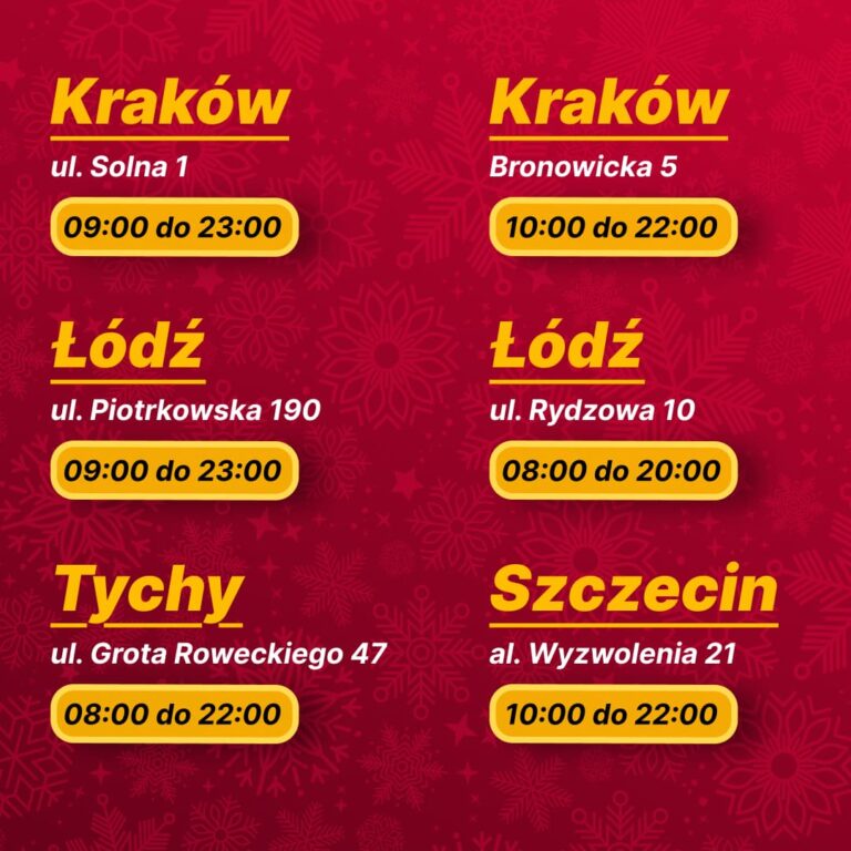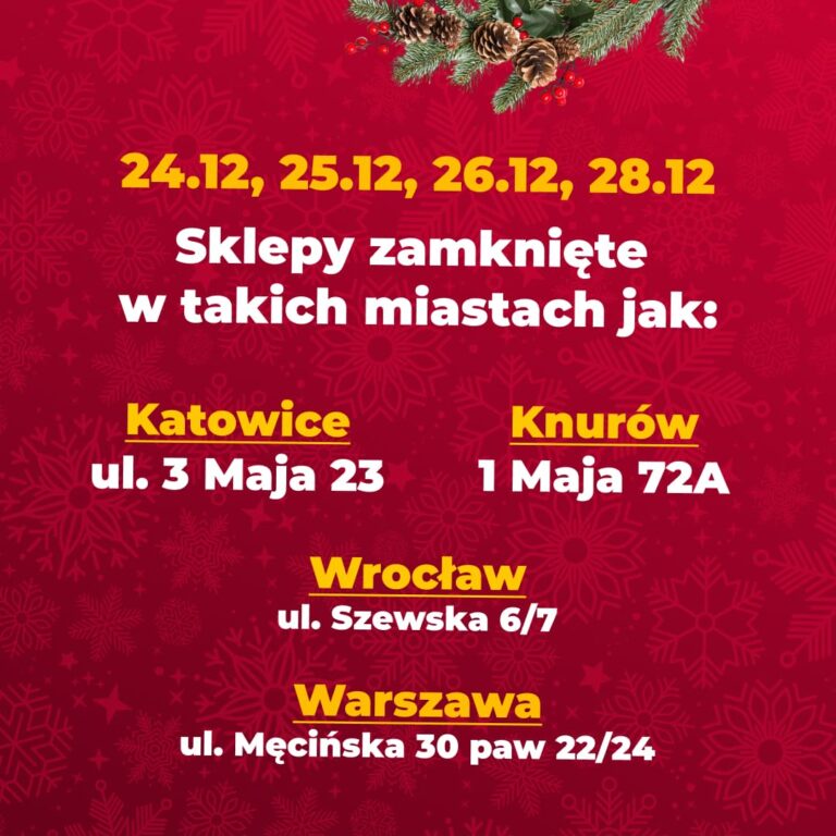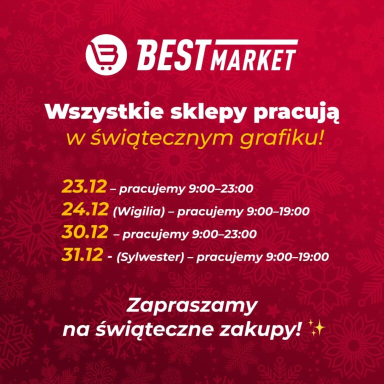 zbliża się okres świąteczny, dlatego przedstawiamy aktualne godziny otwarcia naszych sklepów. W dniach 20.12–31.12 część lokalizacji będzie działać według zmienionego grafiku, a sklepy w datach 24.12, 25.12, 26.12 oraz 28.12 pozostaną zamknięte. Zachęcamy, aby przed wizytą sprawdzić godziny otwarcia swojego sklepu — szczegółowy grafik dla każdego miasta i adresu. Godziny otwarcia mogą różnić się w zależności od lokalizacji, dlatego prosimy o uważne zapoznanie się z informacją. Dziękujemy za zrozumienie i życzymy spokojnych, pełnych ciepła świąt oraz udanych zakupów w Best Market! 🎄